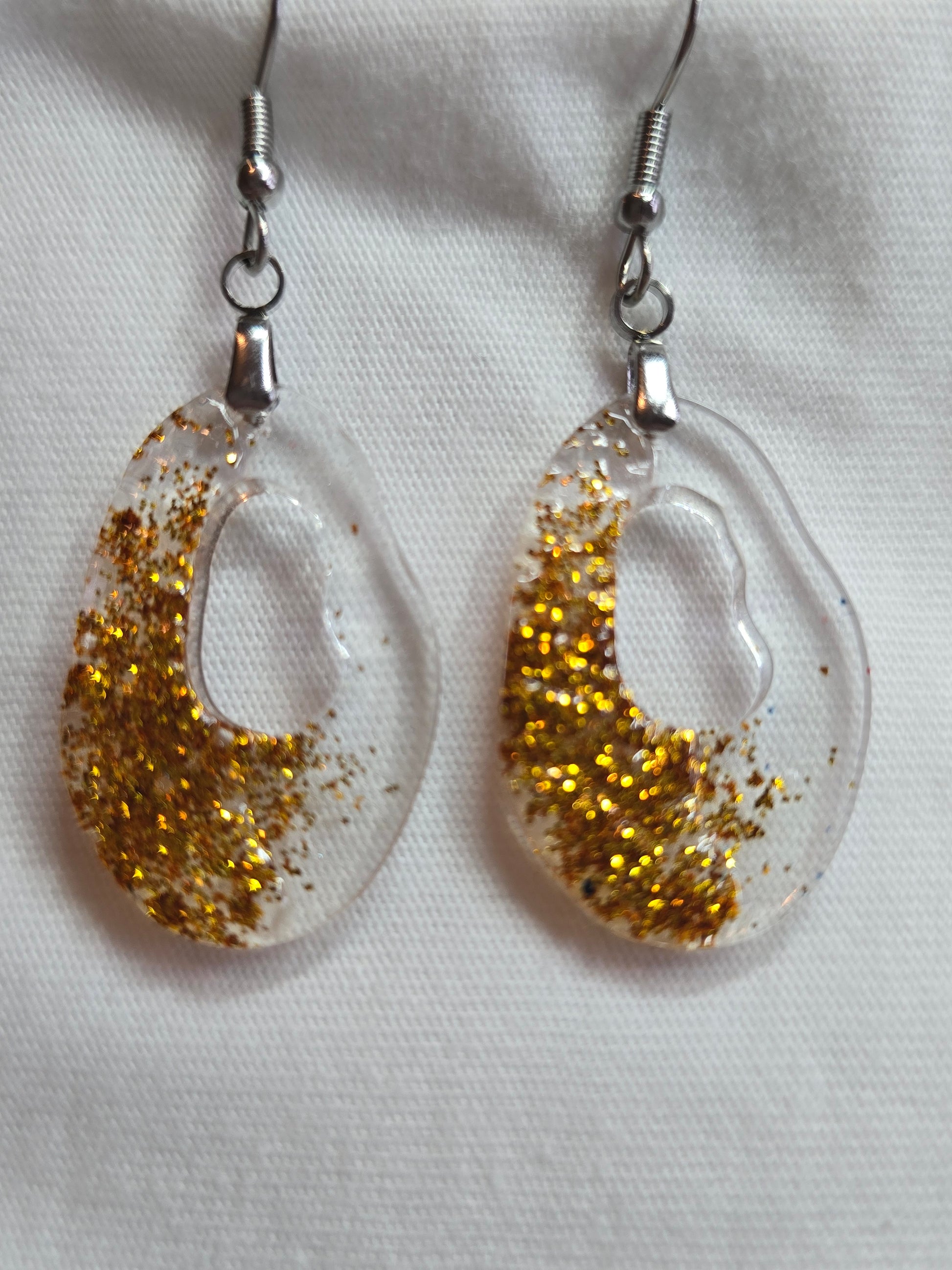 Transparante oorbel van epoxy met glitter en gouden steentjes